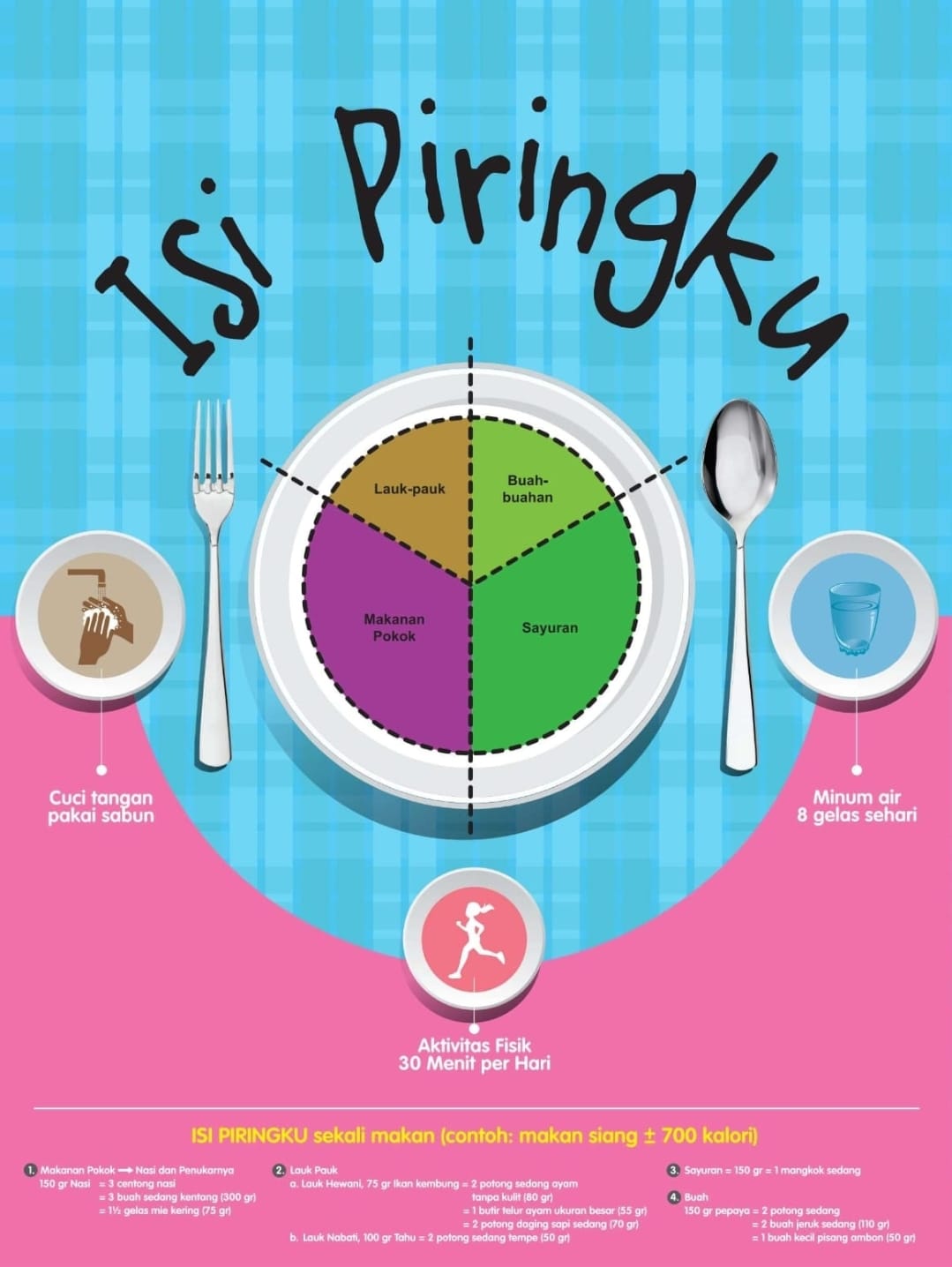 Prinsip Isi Piringku merupakan pedoman sekali makan yang memvisualisasikan pembagian piring menjadi proporsi tertentu. Komposisinya adalah: • ½ bagian piring terdiri dari buah dan sayur, masing-masing ¼ bagian. • ¼ bagian piring berisi makanan pokok (sumber karbohidrat). • ¼ bagian piring berisi lauk-pauk (sumber protein hewani dan nabati). Selain itu dianjurkan: • Minum air putih 6–8 gelas per hari. • Batasi gula, garam, dan lemak. • Cuci tangan sebelum makan. • Lakukan aktivitas fisik 30 menit per hari. Pedoman ini dinilai lebih mudah diterapkan dalam kehidupan sehari-hari dibandingkan pedoman umum sebelumnya.
